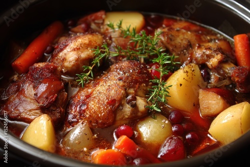 Simmer the chicken in red wine with vegetables