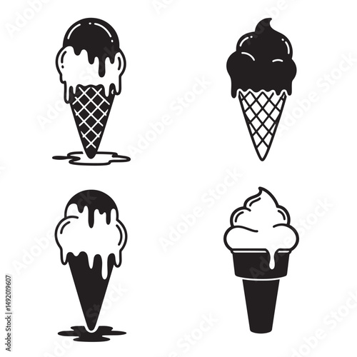 Simple black and white silhouettes of ice cream cones with various styles for dessert designs