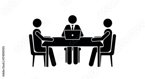 Simple Black Silhouettes of Three People Sitting at a Table with Laptop on White Background Keywords: silhouette, people, meeting, business, discussion, collaboration, teamwork, office, table