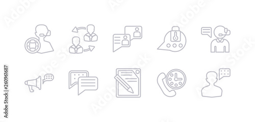 simple gray 10 vector icons set such as speaking, time call, write, chat bubble, announcement, call center, chat. editable vector icon pack