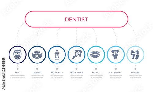 simple illustration set of 7 vector blue icons such as mint gum, molar crown, mouth, _icon4, mouth wash, occlusal, oral. infographic design with 7 icons pack