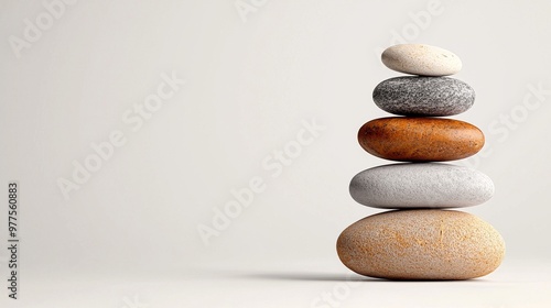 Simple photo of 3 smooth stones stacked on a clean white background. Balanced and natural composition evokes a sense of calmness, harmony and simplicity.