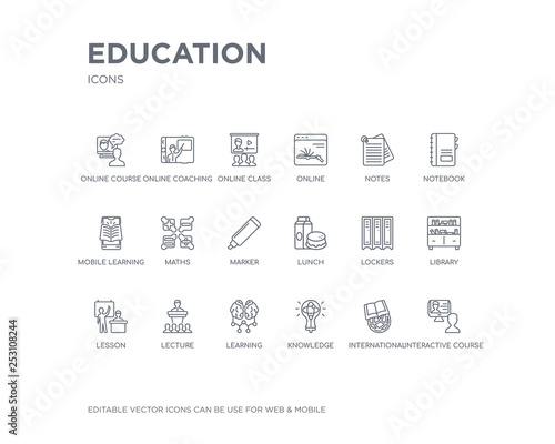 simple set of education vector line icons. contains such icons as interactive course, international, knowledge, learning, lecture, lesson, library, lockers, lunch and more. editable pixel perfect.