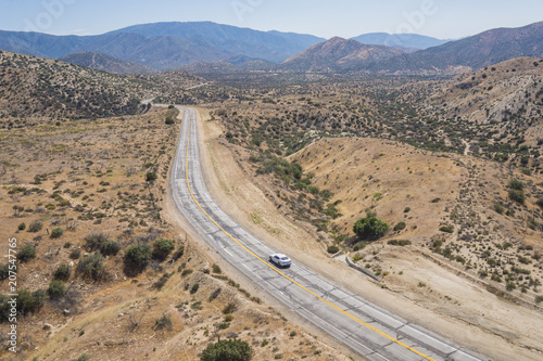 Single car on empty wilderness road in the Mojave Desert of southern California.