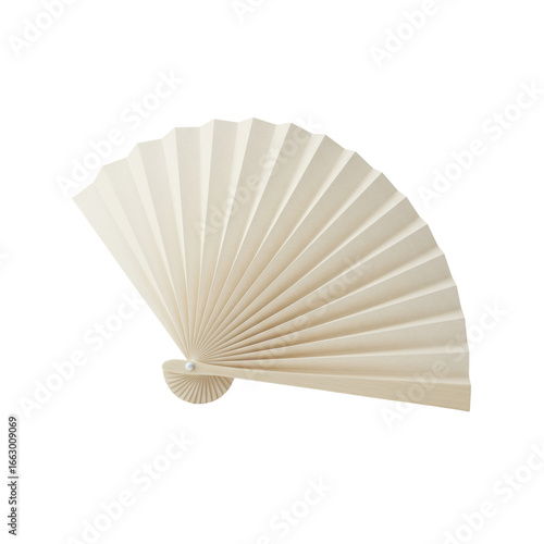 Single, closed, traditional Japanese off-white rice paper fan, elegant & compact, precise commercial studio product shot on stark white background. Concept of Japanese craftsmanship and simplicity