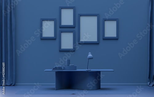 Single color monochrome dark blue color interior room with office desk and plants, 5 poster frames on the wall, 3D rendering
