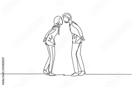 Single continuous line drawing Arabian boy and girl in love and kissing. Couple lovers kissing and hugging. Happy man and woman celebrating wedding anniversary. One line draw graphic design vector