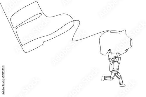 Single continuous line drawing astronaut carrying piggy bank run away from the giant foot. Escape with the assets that will be used for the expedition mission. One line design vector illustration