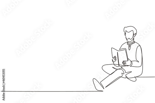 Single continuous line drawing smart Arabian student preparing for exam at home. Young man studying and reading book. Male reader sitting on floor, learning. One line draw design vector illustration
