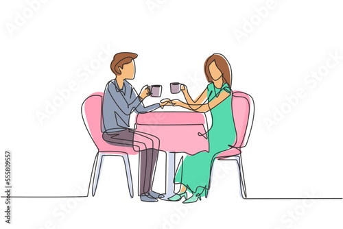 Single continuous line drawing young couple face to face having a romantic dinner, both holding cups. Celebrating wedding anniversary at restaurant. One line draw graphic design vector illustration
