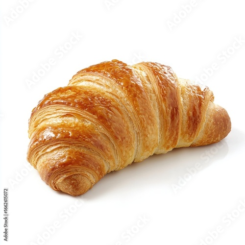 Single croissant, golden-brown, flaky layers, light-brown hue, isolated on white background