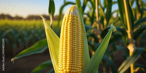 Single golden corn cob ready for harvest standing proudly in the field under warm sunlight, representing organic farming, food sustainability, and rural life