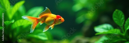 Single goldfish gracefully glides past lush green aquarium foliage , goldfish, swimming