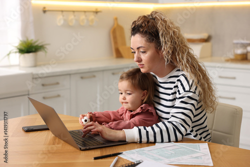 Single mother holding her daughter while working on laptop at wooden table in kitchen
