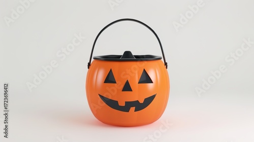Single Orange Jack-o’-lantern Candy Bucket (Black Handle, Smiling Carved Face): Clean White Background, Minimalist Festive Vibe