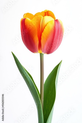 Single orange-red tulip on white background