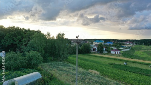 Sinilo village, Minsk region, Belarus - 20.08.2022: A family of storks builds a nest near a human dwelling. Wild birds near human habitation. Storks.