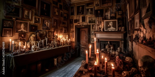 sinister mansion with creepy dolls and portraits lining the walls, with flickering candles and creaking floorboards adding to the spooky ambiance. Generative AI