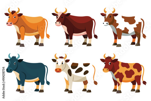 Six Cartoon Cows with Different Colored Fur and Spots