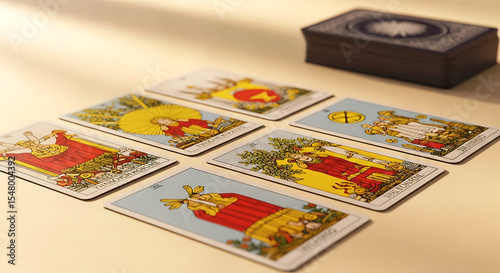 Six tarot cards are laid out in two rows on a surface, with intricate designs and symbols. Light creates soft shadows. A deck is partially visible in the background to the right