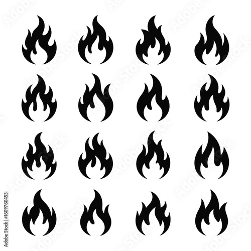 Sixteen Black and White Fire Icons: Simple, Bold, Graphic Design Elements for Branding and Web Design.