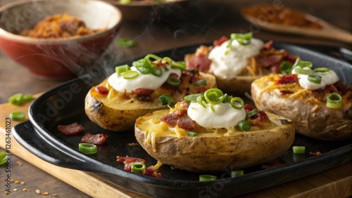 Sizzling Baked Potatoes Topped with Cheese, Bacon, and Sour Cream on a Rustic Wooden Table