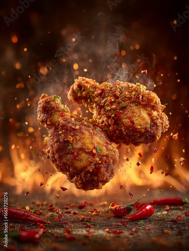 Sizzling crispy fried chicken drumsticks kitchen food photography fiery background close-up flavor explosion