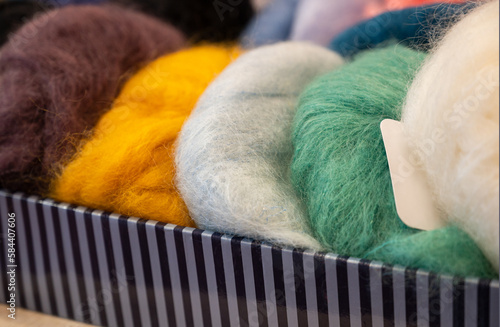 Skeins of colourful wool yarn for knitting. Knitting woolen winter clothes handmade. Balls of thread for needlework on a sewing counter. Close-up.