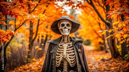 Skeleton in worn, lace-trimmed finery poses amidst rustling foliage, veiled in an eerie haze, its very presence a