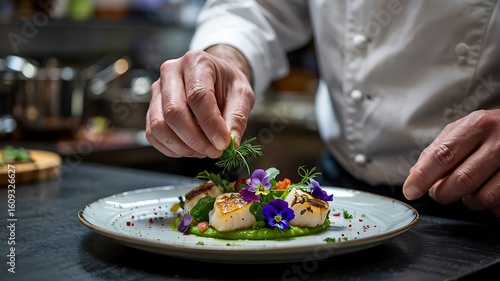 Skilled chef carefully garnishing a beautifully plated gourmet dish with fresh herbs and edible flowers in a professional kitchen