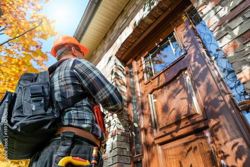 Skilled handyman carrying tools and equipment walking towards front door for household repairs