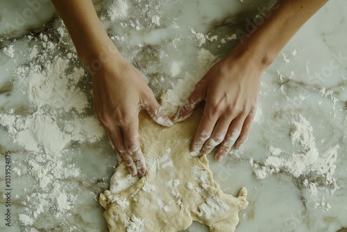 Skillful hands shape dough on a floured marble kitchen countertop, exemplifying the art of cooking, culinary tradition, and the tactile connection in home baking.