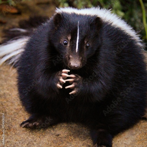Skittish Skunk: Black skunk with distinctive white stripes, curled up in a defensive posture on a rock, showcasing its unique markings.
