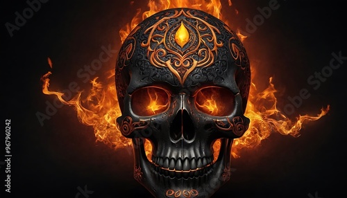 Skull fire flame black background.Fiery Human Skull on a black background. Generative AI illustration of the skull in the fire.,flames, burn, death, devil, fiery, fire,456