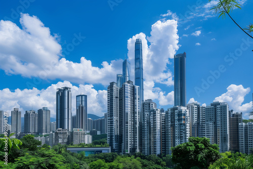 Skyscrapers Viewed from Below with Blue Sky and White Clouds