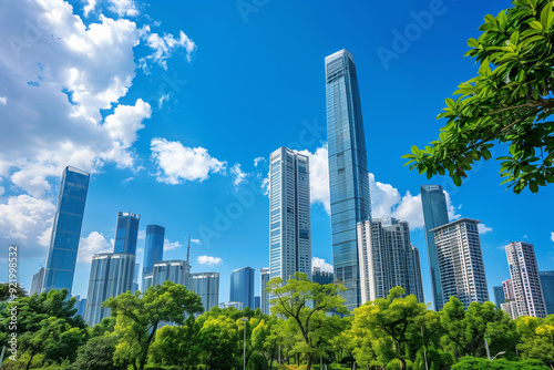 Skyscrapers Viewed from Below with Blue Sky and White Clouds