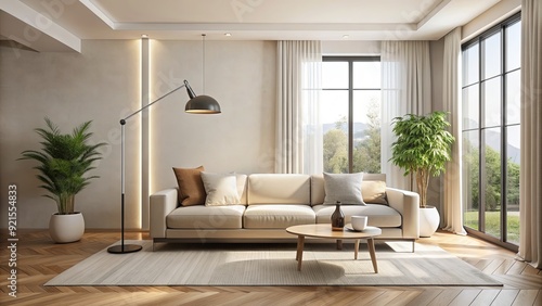 Sleek, modern living room with creamy walls, minimalist decor, and sparse furniture, featuring a low-profile sofa and a floor lamp against a vast, bright window.