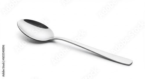 Sleek silver spoon gleams brightly against stark white background. AI Generated