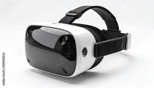 Sleek VR headset with black straps and white body, floating in digital space, symbolizing immersive technology.