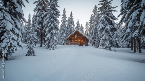 Sleek wooden lodge nestled among snow-laden trees during winter. Remote compact house. Private residence close to the woods. Countryside abode. Trail approaching a cottage in deep snow.
