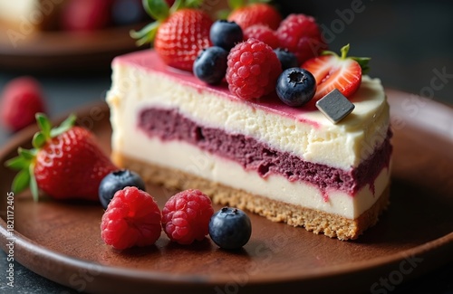 Slice of berry cheesecake with fresh strawberries, blueberries, raspberries on brown plate. Delicious layered dessert with creamy texture, red glaze, perfect for celebrations or casual indulgence.