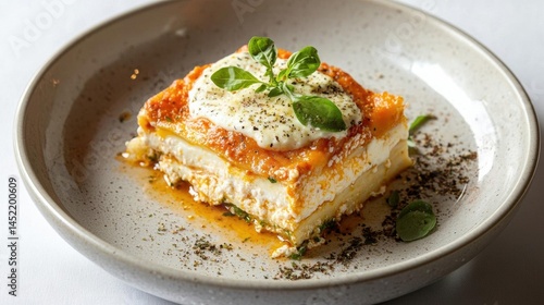 Slice of lasagna on a white plate. the lasagna is layered with layers of white and orange layers, topped with a layer of orange sauce and a dollop of white cheese.