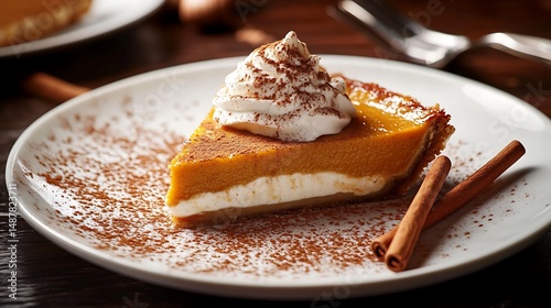 Slice of Pumpkin Pie with Whipped Cream and Cinnamon