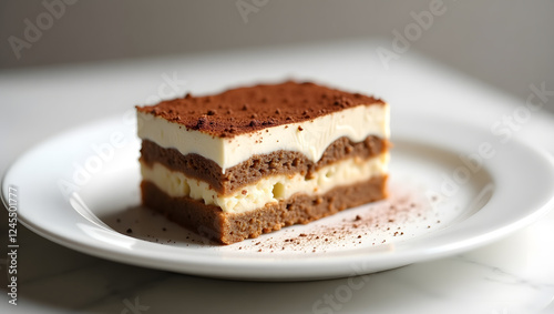 Slice of tiramisu cake on a white plate with cocoa powder. Perfect for food blogs, restaurant menus, dessert recipes, and promotional materials.