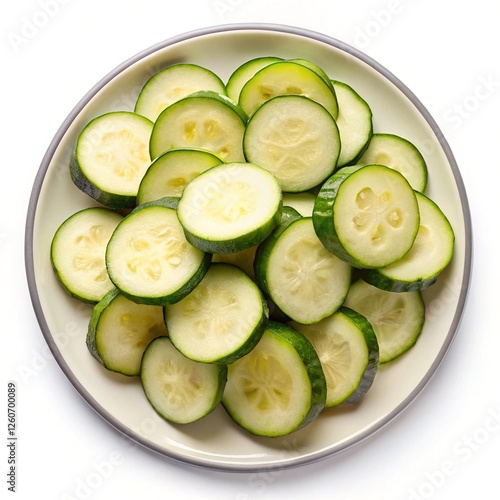 Sliced Zucchini Rounds on White Plate - A plate filled with fresh zucchini slices, showcasing their green skin, pale interior, and crisp texture, ideal for cooking and healthy meals.