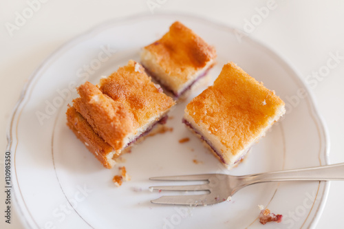 Slices of gluten-free homemade cakes with blueberry filling on the plate.