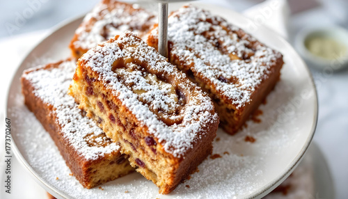 Slices of traditional Christmas fruitcake dusted with powdered sugar, displayed on a tiered stand