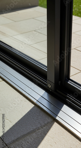 Sliding Door Detail: Sleek Black Frame, Silver Track, Modern Patio Access, Natural Light & Stone Paving