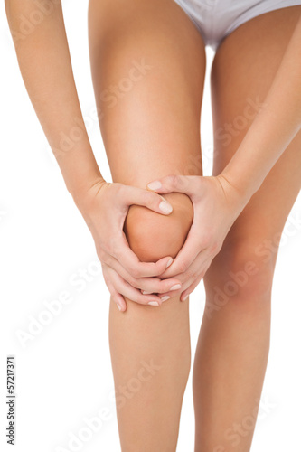 Slim young woman touching her injured knee