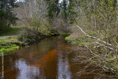 slow forest river in summer green woods with rocks in stream and small waterfalls. Spring landscape